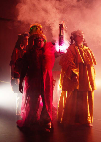 Avslutningen är magnifik när dansarna dekorerar och klär varandra till sagolika drottningar, härskare, mytbärare i Helle Carlssons fantasifulla kostymer.