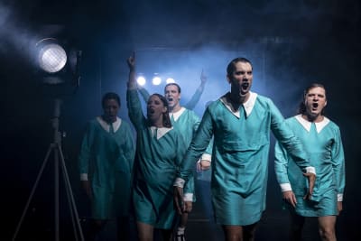 Den otroligt tonsäkra ensemblen är sömlöst förstärkt av praktikanter från teaterhögskolan i Malmö och grupperar sig i jämnstarka par när de skickligt och könsöverskridande alternerar i huvudrollerna som Agni och Evvi.