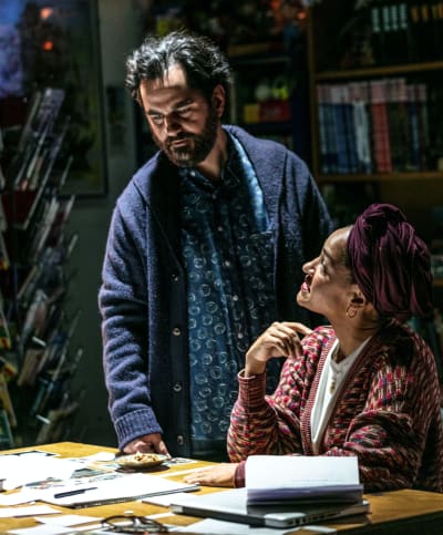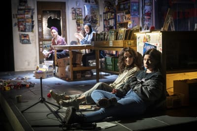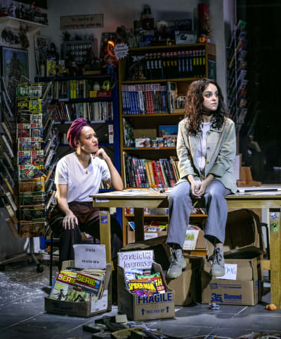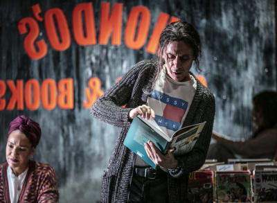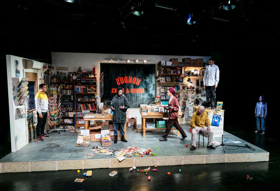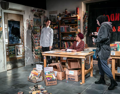 - Nästan hela den långa första akten utspelar sig i den där seriebutiken. Den är oerhört fint och detaljerat uppbyggd, med fanzines, kartonger, dåliga provokativa konstböcker, intressant politisk konst, nytt och gammalt i en enda röra, i ett litet rum man tror på. Ett skräptempel. En jättefin ram till korta täta små scener gör just det som romanen gör, vrider på provokatörer, terrorister, aktivister och svennar och låter dem tala. Det är svart som kol, men låter också alla vara roliga, begripliga.