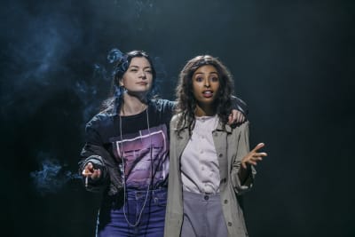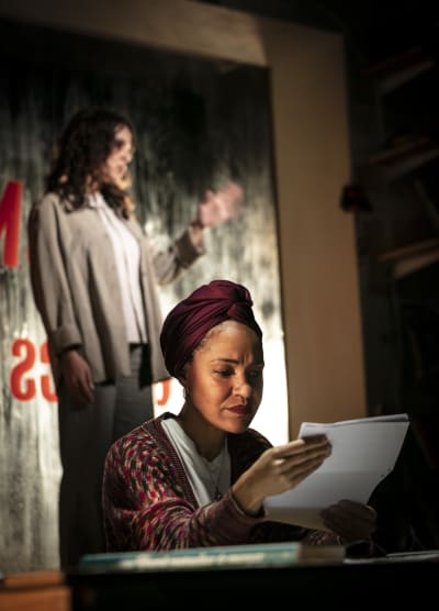 - Berättelsens två parallella lager får på Unga Klaras scen fysisk form. Nour/Annika har dubblerats i två skådespelare: Ester Claesson och Tina Pour Davoy som båda gör något självklart och självlysande av rollen, var och en på sitt sätt.