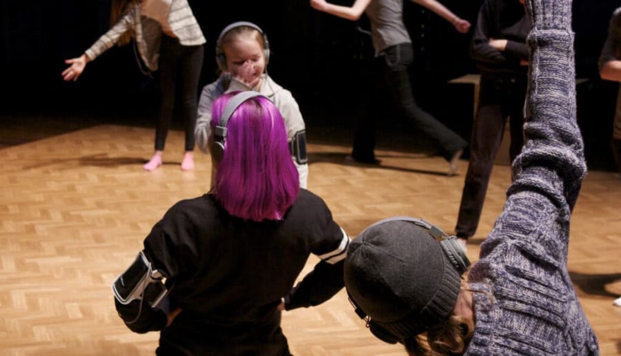 Välkommen in! Ta på ett par hörlurar och låt en röst guida dig i hur du ska röra din kropp och relatera till de andra i rummet. Alla kan delta och inget kan bli fel. Allt är rätt!