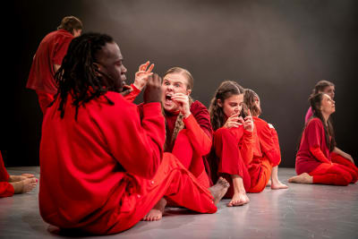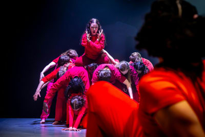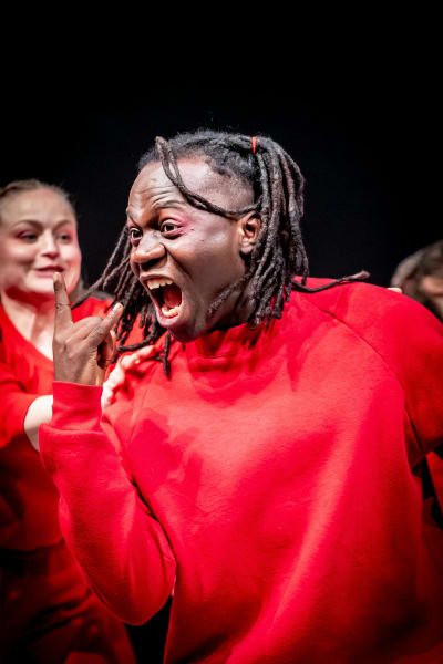 Ett urstarkt kollektiv av individuella personligheter fyller vridscenens rundel med kraftfullt fysiskt utspel, attityder, gester, blickar.