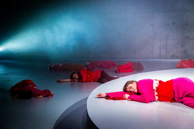 14 skådespelare står på scen, i ett rum inspirerat av det forna Greklands pelare och tempel. Tillsammans berättar de historien om Antigone och Artemis.