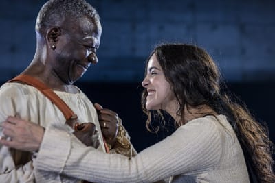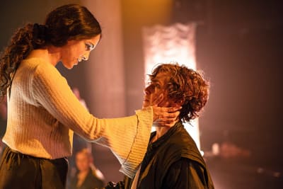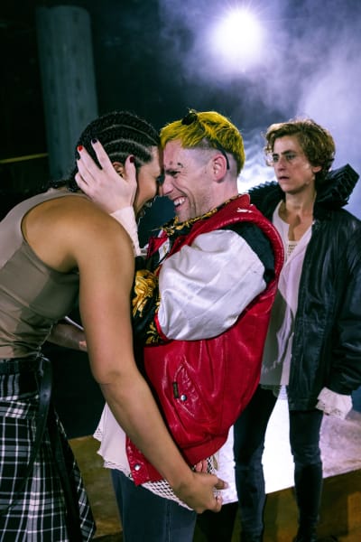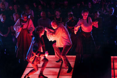Publiken sitter utplacerad runt spelplatsen och tillsammans med de övriga skådespelarna blir vi en del av den kroppsmassa som, likt en imaginär strypsnara, dras åt allt hårdare runt det unga kärleksparet.