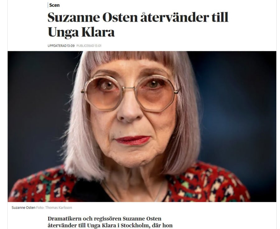 2020-09-14: Dagens Nyheter gör en intervju med Suzanne Osten med anledning av att hon återvänder till Unga Klara med Gunilla Linn Perssons familjeföreställning Buster Keaton på månen, med premiär i augusti 2021!